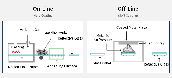 | Manufacturing Process | A coating method in which metal chemical material is sprayed on the surface of sol state glass at about 370~650℃ which was drawn from the Tin Bath during the glass production process. This material is pyrolyzed by the heat of the glass and coats the glass | It is a technique in which the surface of the coating metal target is hit with high-energy ions on a cooled glass substrate. This results in small metal particles in an atomic state being separated and deposited on the surface of the glass substrate that was placed below it. |